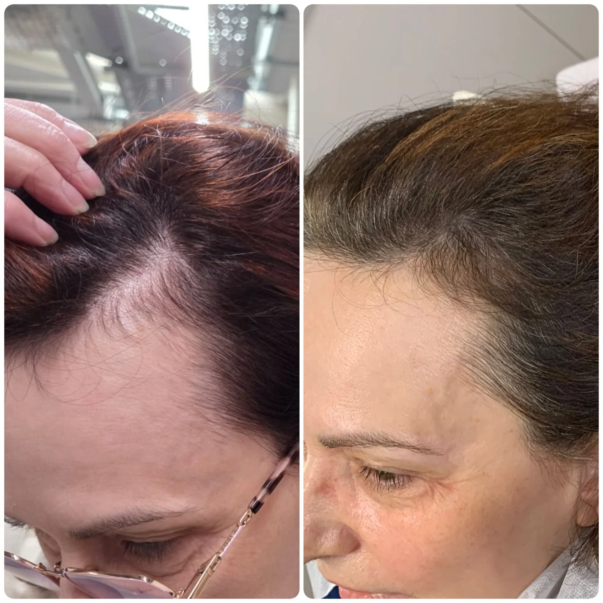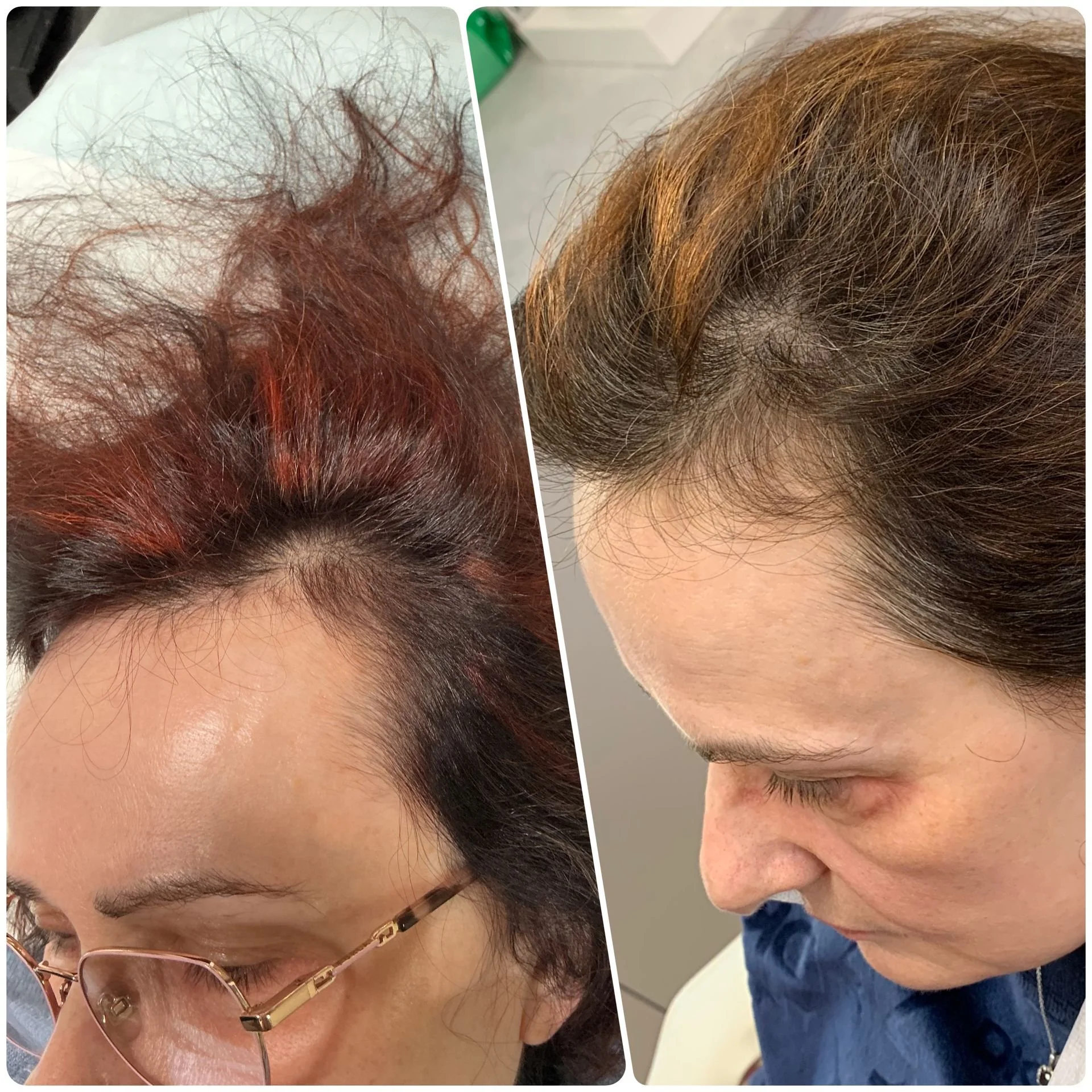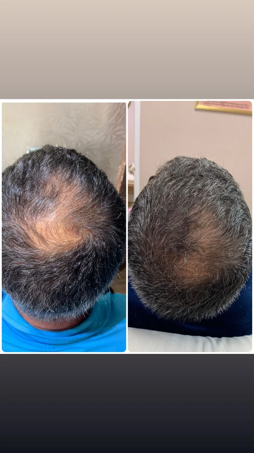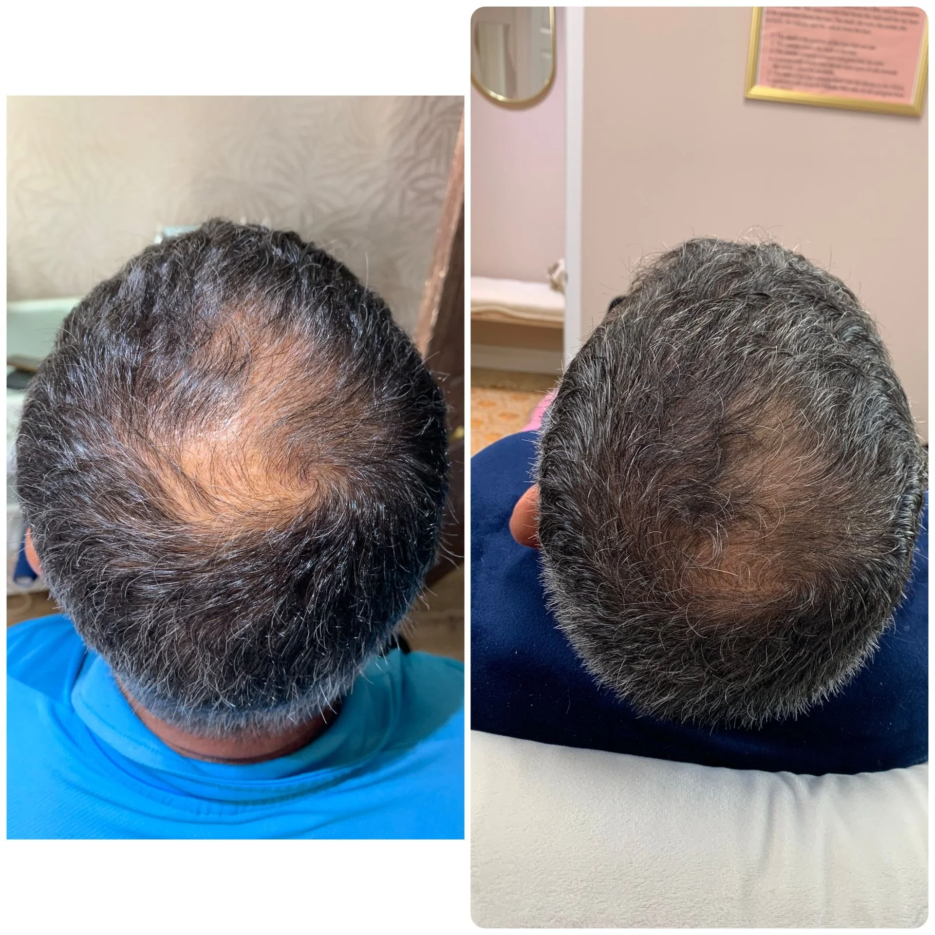Each designed to target thinning areas, nourish the scalp, and support natural hair regrowth. The before-and-after images showcase the visible improvements our clients have experienced, reflecting the effectiveness of our tailored, science-led approach to hair restoration.